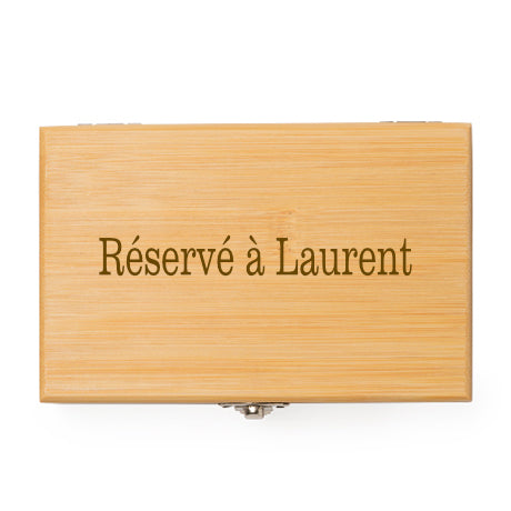 Chaque coffret peut être gravé sur le couvercle avec une phrase courte, un mot doux, une blague, un prénom ou un message unique. Le genre de détail qui transforme un simple accessoire de vin en cadeau personnalisé mémorable.