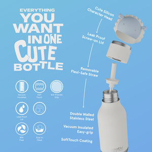 This adorable reusable stainless-steel bottle helps you stay hydrated all day long 🌞. Each comes with a removable and collectible silicone head, adding a fun and unique touch to every sip.